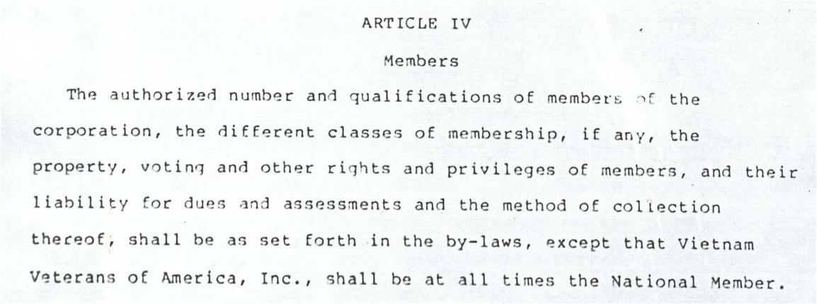 Wording of Chapter VVA 96 articles of Incorporation, Article IV: